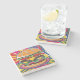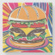 Dans le style d'Henri Matisse, le hamburger est représenté avec des couleurs audacieuses et vives et des formes épurées et organiques. Le pain est un jaune vif et doré avec des bords doux et arrondis, tandis que la pâte est un brun riche, profond, texturé avec des coups de pinceau lâche et expressifs. La laitue verte vif et les tranches de tomate rouge mûre ressortent du pain, leurs formes exagérées et stylisées. L'arrière - plan est une couleur plate et contrastée, peut-être un bleu ou un rouge riche, avec des motifs décoratifs abstraits, ajoutant une touche fantaisiste et moderne à la composition.