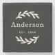 Ce sobre et élégant porte-boissons monogrammé sur mesure possède des branches de laurier verdoyantes qui portent un nom de famille. Un beau cadeau de conservation pour les jeunes mariés ou les nouveaux propriétaires. Les couleurs du design noir et blanc peuvent être modifiées pour correspondre à votre décor maison.