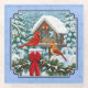 Une paire de Cardinaux rouges du Nord se perche sur une palissade blanche recouverte de neige, ornée d'une guirlande de Noël et d'un arc rouge vif. Ils se régalent d'une mangeoire d'oiseaux d'hiver décorée de cloches de Noël, de rubans et de saints. Oeuvre réaliste créée par l'artiste faunique Crista S. Forest.