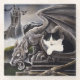 Un chaton smoking noir et blanc est assis à côté d'une gargouille. Derrière eux se trouve un château et des dragons.