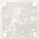 Un collier frontalier marron et blanc est assis dans une boîte en carton débordant de lamelles dorées et de baules de Noël colorées. Le chien est le point focal de l'image, regardant directement la caméra avec une expression calme. Il est entouré de décorations festives, avec un sapin de Noël pétillant en arrière - plan. L'éclairage chaleureux et l'atmosphère cosy mettent en valeur le thème des vacances.
