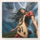 Une belle femme avec une longue brune à flot dans une robe rouge avec une guitare dans une perspective tordue. La foudre dans le ciel ajoute une sensation de drame à l'image et est accentuée par les tons bleu foncé dans le ciel.