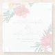 Ce dessous de verre personnalisé est décoré sur le thème d'une plage tropicale ou d'une île mariage. L'arrière - plan est un blanc simple et élégant, avec des fleurs hawaïennes colorées et tropicales. Des bouquets floraux avec feuilles de palmiers, hibiscus et frangipaniers accentuent les frontières.
