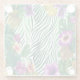 L'image montre une mosaïque vivante de feuilles de Monstera abondantes, vertes et jaunes, combinées à des fleurs magnifiques de couleur pourpre et d'oranges qui se détachent d'un fond dynamique et ondulé. Il émet une énergie sauvage et tropicale et une abondance joyeuse qui éveille curiosité et amour naturel.
