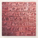 Un dessous de verre en verre rouge avec des hiéroglyphes anciens gravés sur pierre.