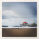 Un matin d'hiver orageux à Huntington Beach, Californie du Sud. Vue sur le Ruby's Diner au bout de la jetée, ombre de l'île Catalina au loin, et de grandes vagues qui en font un spot de surf populaire.