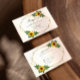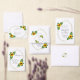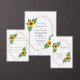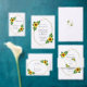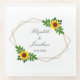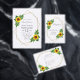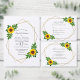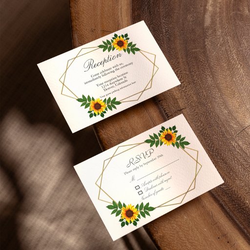 Le design présente des tournesols et des feuilles botaniques sur un cadre géométrique imprimé couleur or.
