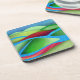 Un paysage abstrait aux couleurs et textures vibrantes montrant des collines flottant sur la glace dans les tons vert, bleu, cyan, rouge et rose.