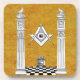 En vente sont des dessous de verre maçonniques de boissons comportant de nombreux symboles maçonniques, incluant : les piliers, trottoir checkered, changent, et le carré et les boussoles entourés par des rayons de gloire.
