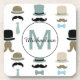 Ces somptueux chapeaux, moustaches et cravates d'arc sont mis en motif sur un arrière - plan blanc. Les couleurs sont turquoises, bleu clair, bronzées, marron et noir. Une bannière en cercle blanc au centre tient votre monogramme en bleu assorti et votre nom en noir à travers.