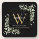Sous-verre avec monogramme de feuilles de verdure à l'aquarelle élégante avec une initiale de monogramme dorée sur un fond noir chic. Conçu par Thisisnotme