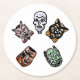 Les 5 personnages d'Halloween classiques sur un dessous de verre papier de fête d'Halloween dans une option sombre. Serez-vous la sorcière, le diable, le pirate, le chat ou le crâne à votre fête d'Halloween ?