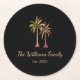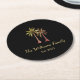 Dessous de verre en papier noir Tropical Beach, avec un dessin de palmiers et des lettrages personnalisables. Idéal pour votre été divertissant et de plaisir.