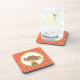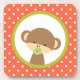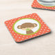 Un dessous de verre avec un mignon petit singe tenant une suce dans sa bouche à l'intérieur d'un cercle avec une bordure verte d'olivier. L'arrière - plan est un motif à pois orange et blanc.