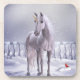 Ajoutez une touche de magie à votre divertissement avec ces dessous de verre avec une licorne blanche à neige avec une longue crinière et une queue à flot et une corne dorée debout dans la neige qui tombe doucement dans cette oeuvre numérique de l'artiste Jayne Wilson.