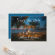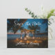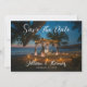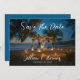 Destination Beach Wedding Save The Date Announcement Card. Design features a candle lit cabana on a white sandy beach with palm trees an ocean in the background. The front text includes: Save The Date, the Bride and Groom's Names and Wedding Date. The reverse side text includse: The Wedding Location Name, Details and Formal Invitation To Follow - on a tropical blue background. To personalize, simply insert your text details into our easy template replacing the sample. Available in print or digital download.