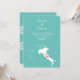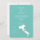 Stylish destination Italy wedding invitation for couples getting married abroad in the European country, Italy which is shown in a map silhouette with sweet red love hearts. In tones of teal and white with a lacey patterned circle on the back, very pretty and easy to customize with your wedding details.