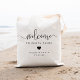 Welcome guests to your destination wedding with these chic and modern personalized tote bags. Design features "welcome" in modern handwritten calligraphy script, with space to personalize with your wedding location, names and date. A small heart silhouette illustration completes the design.