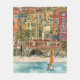 A beautiful watercolor and ink design created by the brilliant Melissa Wang, brought to you by World Art Group. In the foreground of this piece we can see a small sailboat just offshore a small beach populated by a number of items, people and palm trees. This scene could take place in somewhat a holy or religious city as the background and top tier is decorated with crucifixes or crosses towering over the foreground of the artwork. Perhaps this angle was an intentional perspective by the artist to signify the religious significance of this city.