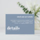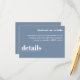 Gardez votre papeterie mariage élégante et simple avec cette invitation Minimal Détails Mariage. Doté d'une disposition propre et moderne avec une typographie intemporelle, cette carte est parfaite pour partager toutes les informations importantes sur votre grand jour. Son design minimaliste garantit que vos détails restent au centre de l'attention tout en complétant tout style mariage. Idéal pour les couples qui apprécient l'élégance sobre et l'esthétique contemporaine.