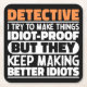 Funny Detective Sayings "Detective I Try To Make Things Idiot Proof But They Keep Making Better Idiots". Grab this Funny Detective design as a funny gifts for an awesome mom, dad or friend.