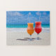 Puzzle amusant sur la plage avec l'image de deux boissons assis sur le sable de plage. Un cocktail orange et un cocktail rouge aux pailles sont dressés contre une mer turquoise. Changez la taille de ce puzzle si vous le souhaitez. Il s'imprime comme vous le voyez dans l'aperçu.