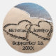 Belle photo professionnelle originale de deux coeurs écrits ou dessinés dans le sable le long de l'eau bleue de l'océan pour signifier amour et romantisme. Insérez facilement le nom de la mariée et du marié, ou de tout couple, dans le coeur et la date, ou d'autres informations, sous le coeur tel qu'indiqué pour customiser. Les exemples de noms sont écrits dans le style et la couleur de police correspondant parfaitement qui peuvent également être changés facilement. Deux tailles d'autocollants sont disponibles dans le joint rond montré. Un magnifique sceau autocollant avec de grands concepts d'amour pour les fiançailles d'été, mariages, anniversaires, et enregistrer les invitations de dates et annonces pour le couple heureux.
