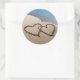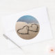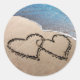 De beaux autocollants et enveloppes avec une photo originale de deux coeurs écrits dans le sable le long de l'eau bleue de l'océan pour signifier amour et romantisme. Super concept pour les mariages d'été à venir.