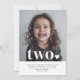 Une simple invitation pour le deuxième anniversaire avec votre propre photo et les mots "deux" en haut, avec un coeur. Vous pouvez modifier tout le texte ainsi que la couleur du texte et du coeur.