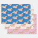 Un ensemble de 3 feuilles plates papier d'emballage avec un motif de deux pêches délicieuses. Une feuille est bleue, une rose et une couleur pêche légère. Idéal pour un baby shower ou un anniversaire.
