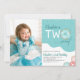 Cette mignonne invitation turquoise fête d'anniversaire est conçue pour une fille qui a 2 ans. Le texte moderne dit "(Nom) est DEUX sucré" accentué avec et givré beignets et offre une photo verticale. Photographie © Storytree Studios, Stanford, CA
