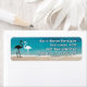 Deux étiquettes de adresse de plage de flamants roses avec trois ou quatre lignes de texte. Les étiquettes maigres de la scène de plage ont un style de police "shadow" audacieux en blanc sur bleu turquoise de l'eau. Le couple de flamants est noir et blanc.