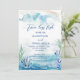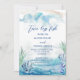 Deux Poissons de moins dans le Faire-part de mariage d'été de la mer. Notre design chic côtier pour les mariages d'été, les fêtes de fiançailles, ou les dîners de répétition comprend une paire de baiser de poisson d'aquarelle bleue, Ajouter un texte personnalisé à l'arrière pour fournir des informations supplémentaires.