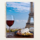 Deux verres de vin rouge avec snacks avec vue sur Paris et la tour Eiffel. Verre de vin rouge avec différents snacks - assiette au jambon, tranché, fromage bleu. Fête romantique en couple. Café avec vue.