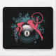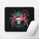 Retro devil girl draped over an eight-ball, with felt-green splatter. All shirts, all sizes.