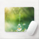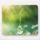 Large water droplet acts as a lens, beautifully refracting an image of a daisy with a string of other droplet haning on a green stem