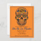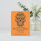 A painted sugar skull postcard party invite to celebrate Dia del los muertos, colourful florals and skull against orange.
