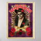 Vintage Day of the dead (Dia los de Muertos) Mexican travel poster from Oaxaca Mexico featuring a handsome face painted sugar Skull man surrounded by gold guns, red and black roses on a purple and pink background.