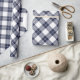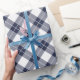Sophisticated wrapping paper features navy blue, white, and light blue diamonds in a bold, buffalo plaid with thin white lines through the dark diamonds.