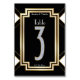 Un design vintage coordonné Mariage Réception Table Numéro carte inspirée du mouvement Art Déco des beaux-arts du début du XXe siècle. Des formes géométriques pimpantes et épurées en noir, blanc et faux or forment un design élégant. Les accents Faux diamant sur le numéro trois complètent le design.