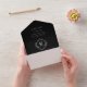This black wedding invitation features a modern diamond-shaped monogram at its centre, with the bride and groom's initials prominently displayed. The monogram is surrounded by classic typography in a vibrant bright pink, adding a touch of elegance to the design. Delicate floral details further embellish the invitation, giving it a romantic and timeless feel. The overall design is sophisticated and unique, making it a perfect choice for a stylish and sophisticated wedding.