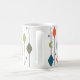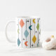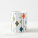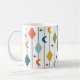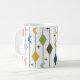 This mug has a mid-century modern design of vertical lines with diamonds and boomerangs, with starbursts scattered in the background.