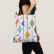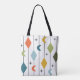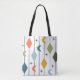 This tote bag has a mid-century modern design of vertical lines with diamonds and boomerangs, with starbursts scattered in the background.