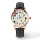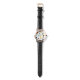 This women's watch has a mid-century modern design of vertical lines with diamonds and boomerangs, with starbursts scattered in the background.