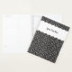 This planner has a damask pattern of ornate diamond shaped white scrolls on a black background. Customize your text in the wavy white banner at the top on the front with the template.