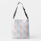 This crossbody tote bag has a mid-century modern design of vertical lines with diamonds and ovals in three different designs repeating across the design. If you like the design but prefer different colours, message me.