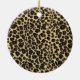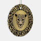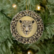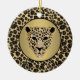Round ceramic ornament with an image of a gold and diamond-studded jaguar head on brushed gold with a black border on a background of leopard print. The back has an image of leopard print. See the entire Gemstones & Medallions Ornament collection in the HOME section.