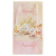 A pink and cream coloured gift bag, surrounded by a pink and cream glittery, sparkley frame. It is embellished with a bouquet of pink roses, flowers, lace, pearls and ribbon, topped with a gold tiara bejeweled with pink jewels. Befitting for a baby shower, girls party,bridal shower or any occasion that suits your need. Personalize if you wish.
