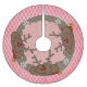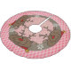 Beautiful Christmas holiday tree skirt features three cute reindeer on a background of pink diamonds, a strip of solid brown, and an aqua blue centre with white polka dots and snowflakes.