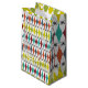 This gift bag has a mid-century modern design of stretched diamonds and starbursts on a field of white.